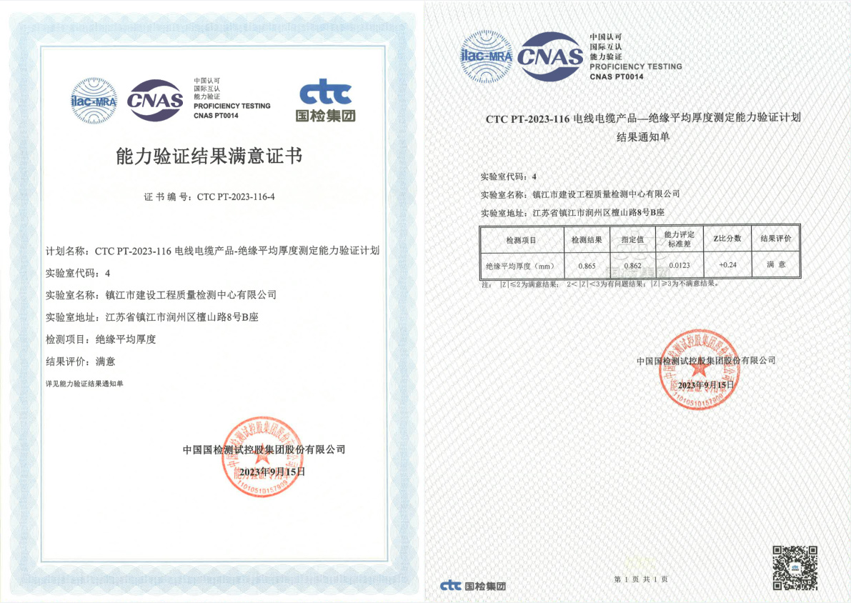 PT-2023-116电线电缆产品-绝缘平均厚度测定能力验证计划,我科室顺利通过了此次验证并获得满意结果。