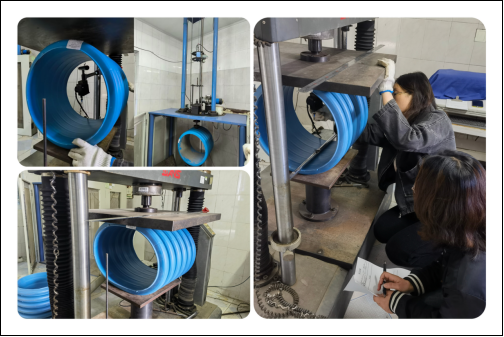 此次学习选择管材品种为:聚乙烯双壁波纹管。学习开始前,试验员详细介绍了样品的取样要求,特别是关于环刚度、环柔性的试样,在满足长度的要求下也需要有足够数量的完整波形。过程中试验员对环刚度、环柔性、落锤冲击的检测注意事项进行了介绍。此外,“烘箱试验”通过试验员的讲解,科室代表了解了此项检测的过程以及判定规则。同时,对窗口日常出现频率较高的管材取样进行了充分的交流讨论。